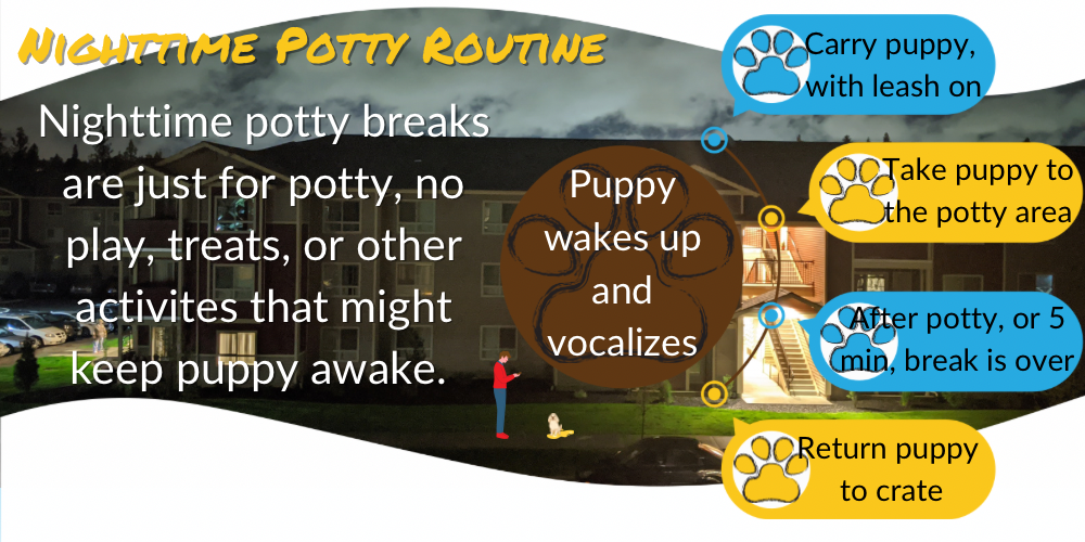 Nighttime fussy behavior.If the puppy wakes up and vocalizes in the night, the responsible person gets up, removes the puppy from the crate, leashes them, and carries them to the potty area to void.