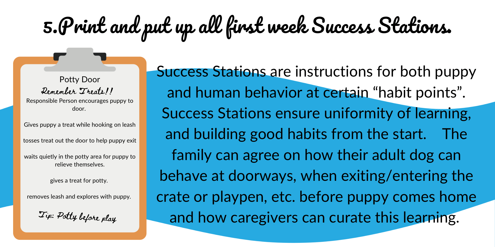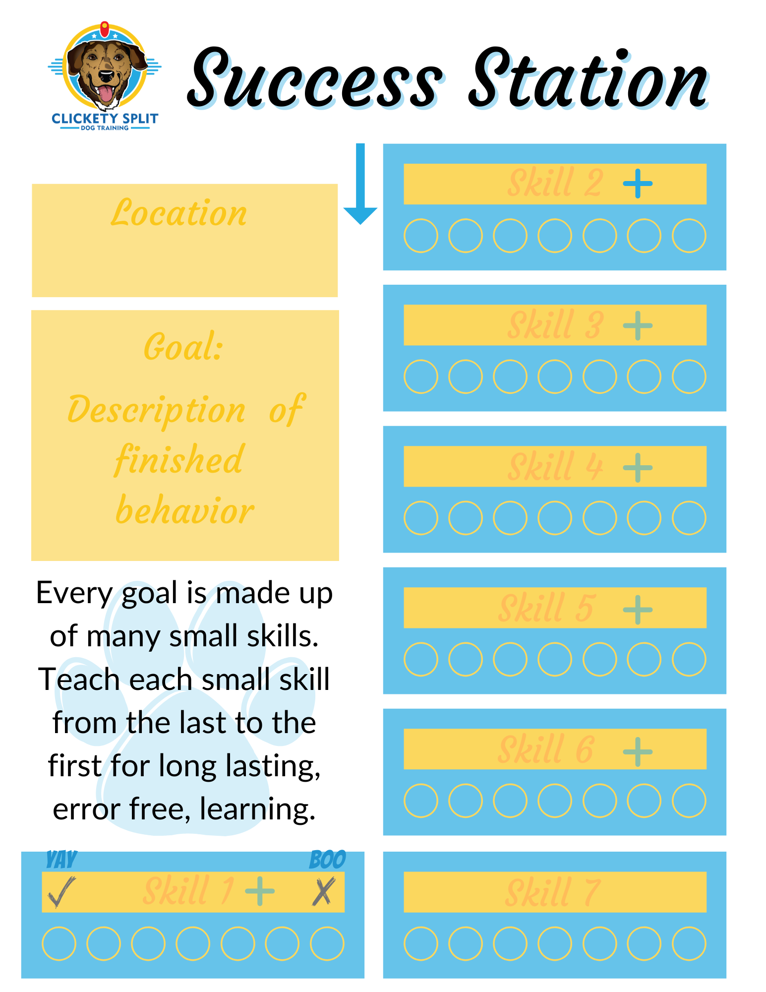Success Stations are, well….important for success. By discussing how you want your dog to behave at important “behavior hot spots” you can save yourself a lot of upset, stress, and expensive training later. Front doors, back doors, entering/exiting crates and cars, meal times, all have human behavioral expectations that are unnatural for our dogs. By starting early and kindly curating the desired habits your dog will mature into a mannerly companion who understands how to communicate needs and wants to you. The following Success Station worksheet is included as a PDF in the Resources section.
