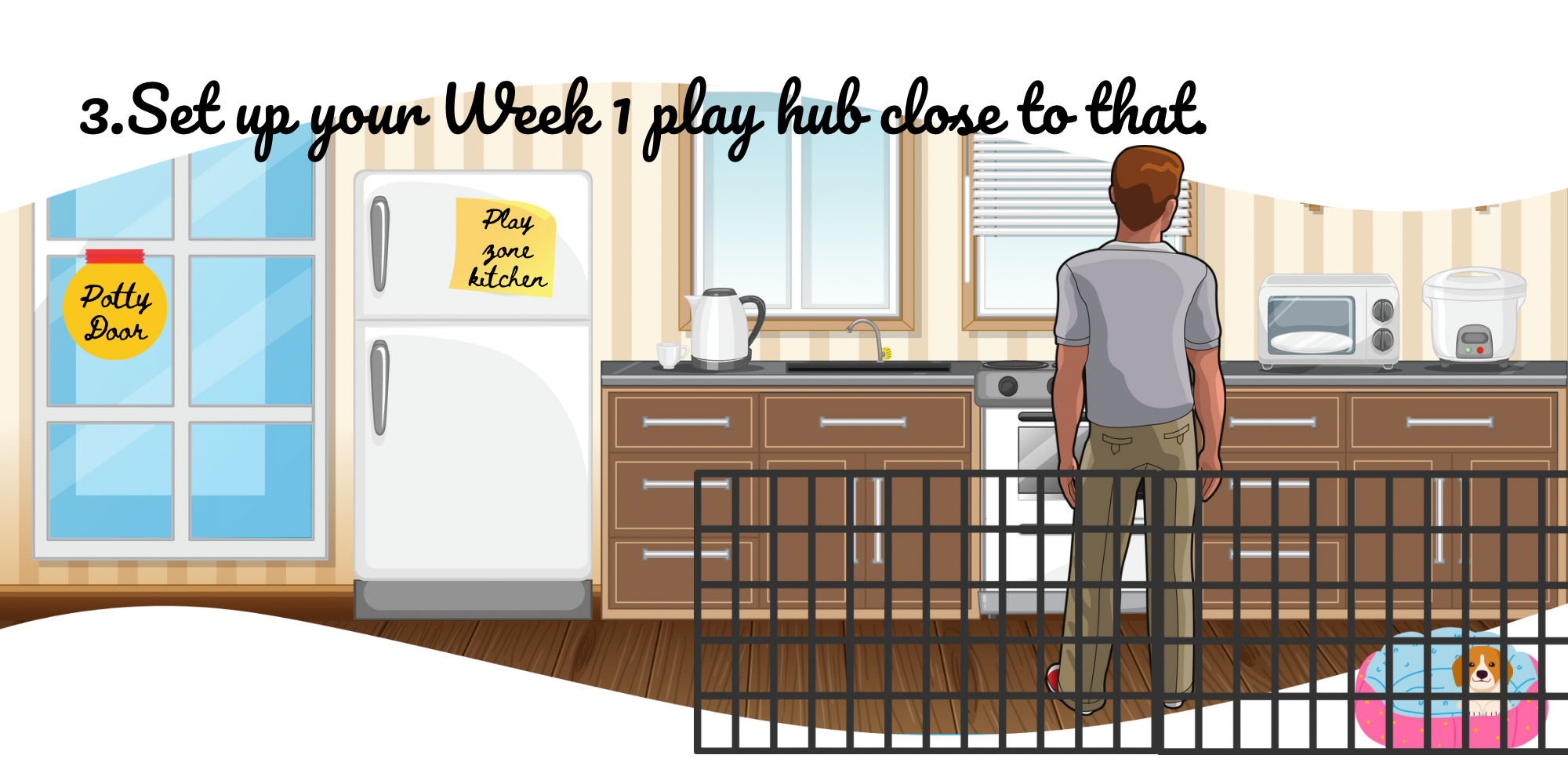 During Week 1 of the 2 weeks you are acquiring needed items and setting them up then that last week, you are living with your management choices, getting in the habit of opening and closing doors, puppy proofing any area the puppy will have off leash access to, installing baby gates, and setting up Puppy’s sleeping area (in a bedroom) and your day time play area (close to a back door). Imagining and getting used to how this will work and making adjustments as needed.