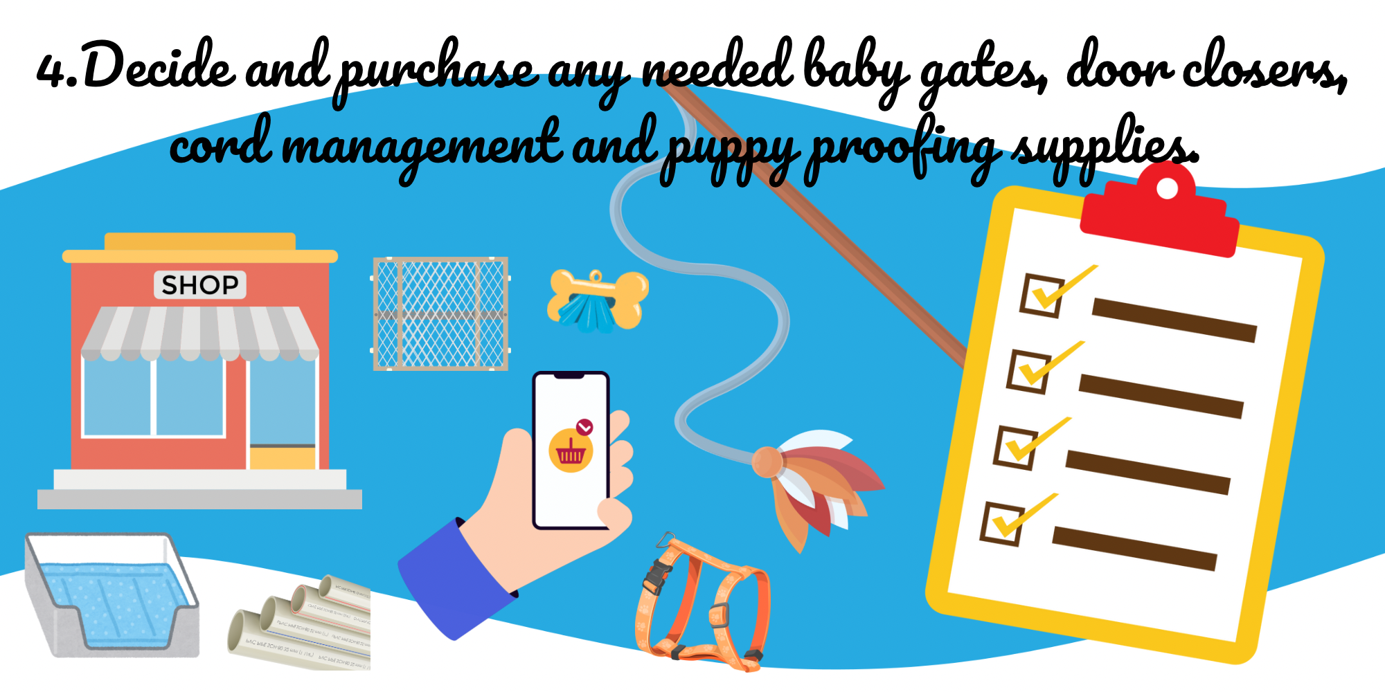 Once you have decided on a bedroom set up, a play hub, and a day pen area you can make a list of needed supplies to borrow, purchase used, or purchase new. Don’t forget supplies needed for puppy proofing such as PVC pipe to protect electric cords, table, and chair legs, baby gates, and door closers.