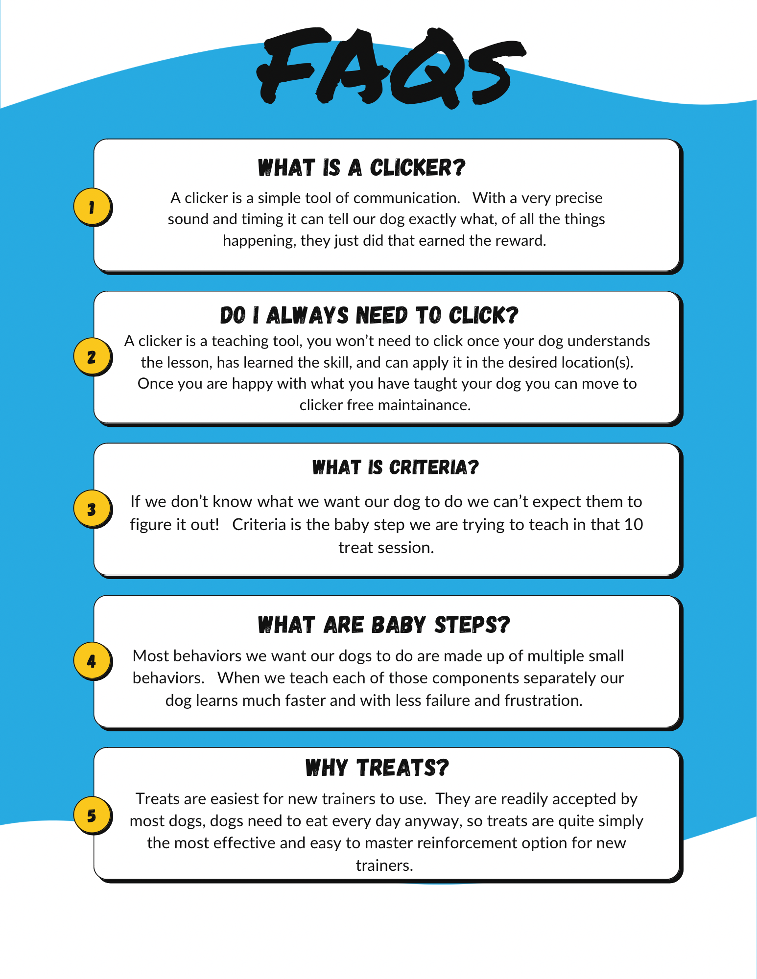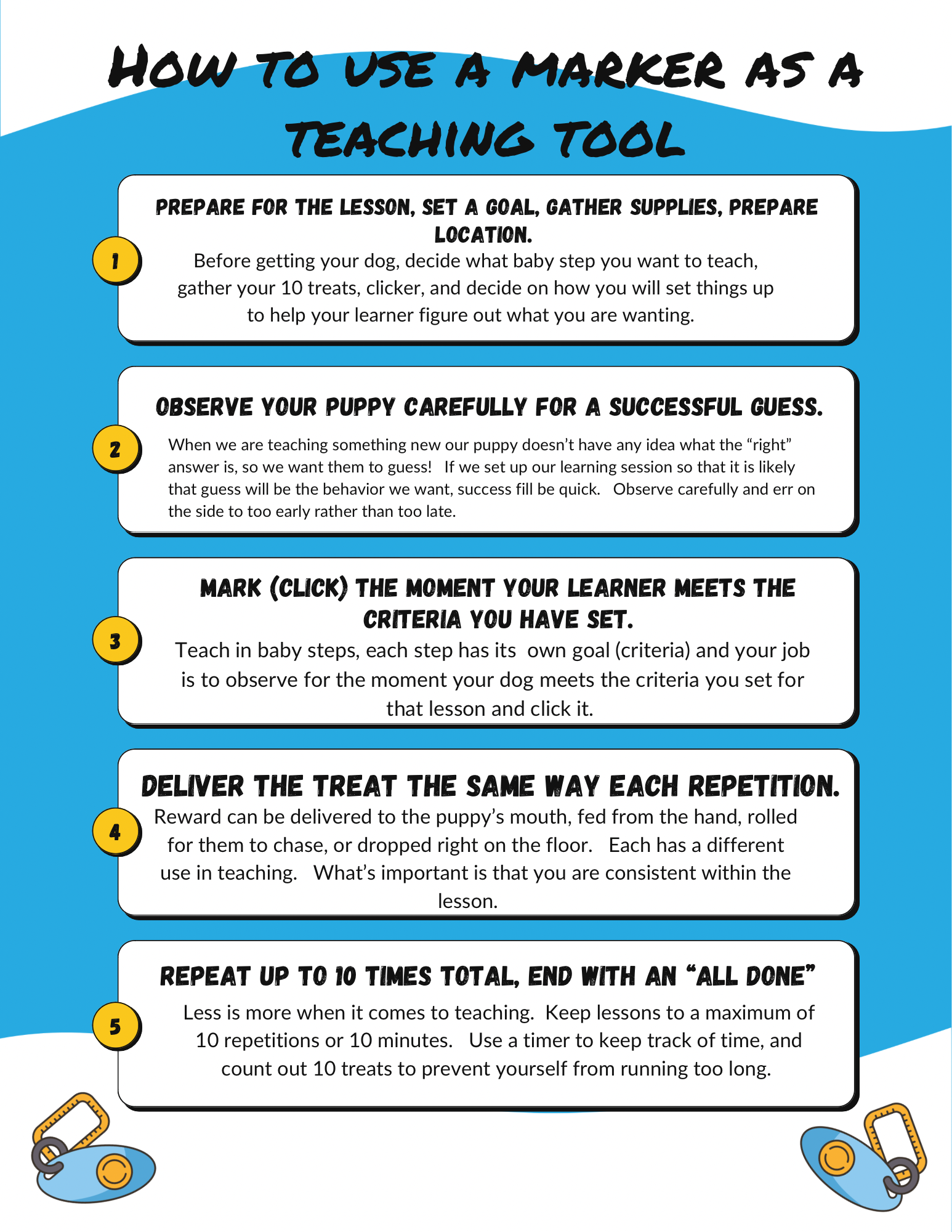 We are only teaching a very small set of skills we will be using in the house training plan. We will be using positive reinforcement, a clicker, and treats to both teach and practice these behaviors so our puppy can learn them efficiently and effectively. So grab your clicker and set up your success station with treats!