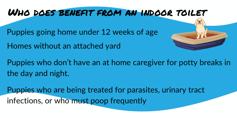 The benefits even extend into the life of many adult dogs. For dogs who live in urban areas having a toilet inside decreases accidents, allows owners to avoid middle of the night trips outside, and provides for a place to go when weather is severe.